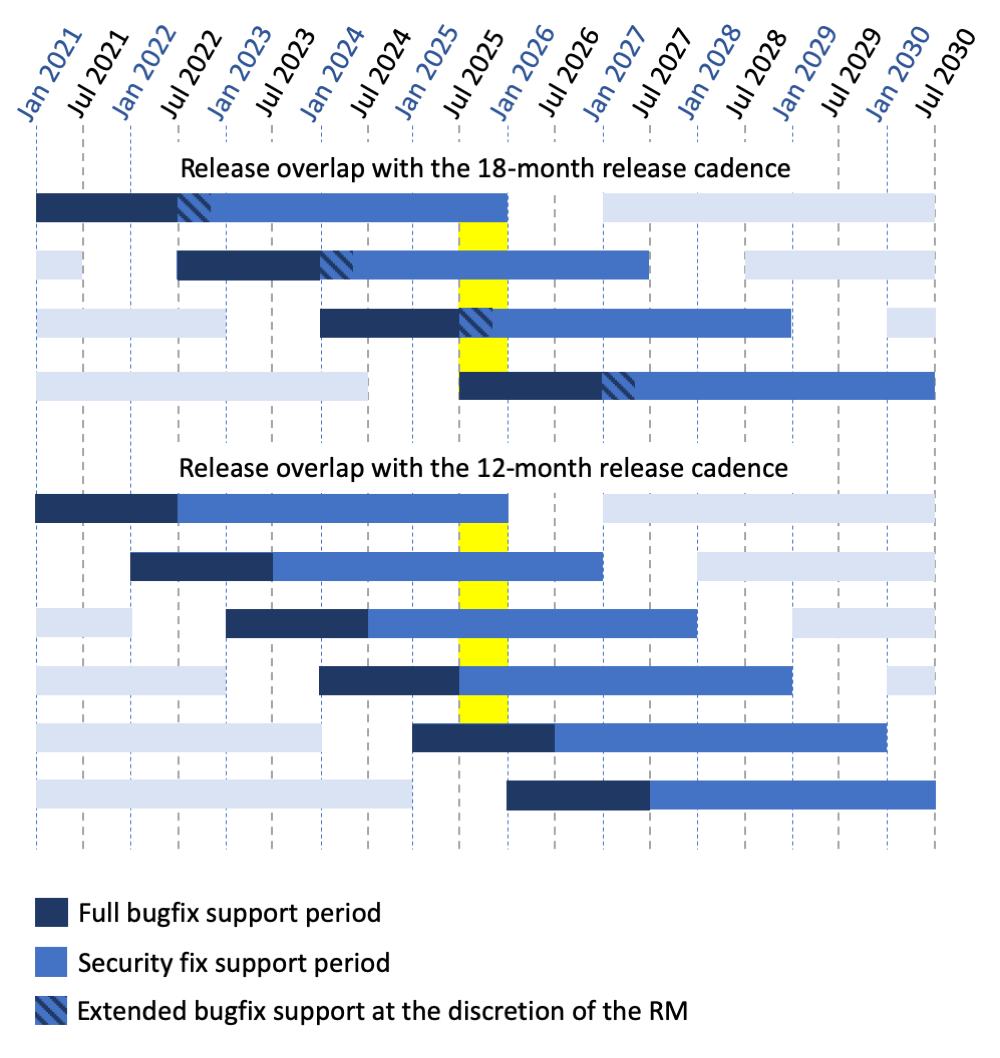 The “extended bugfix support at the discretion of the Release Manager” stage of the current release cycle is not codified. If fact, PEP 101 currently states that after the release of Python 3.(X+1).0 only one last bugfix release is made for Python 3.X.0. However, in practice at least the last four versions of Python 3 overlapped with stable releases of the next version for around six months. Figure 2 is including this information to demonstrate that overlap between stable version releases with the 12-month release cadence will be nothing new.